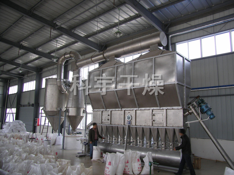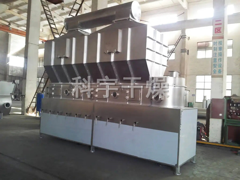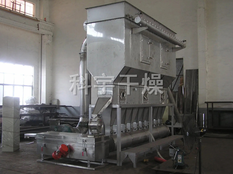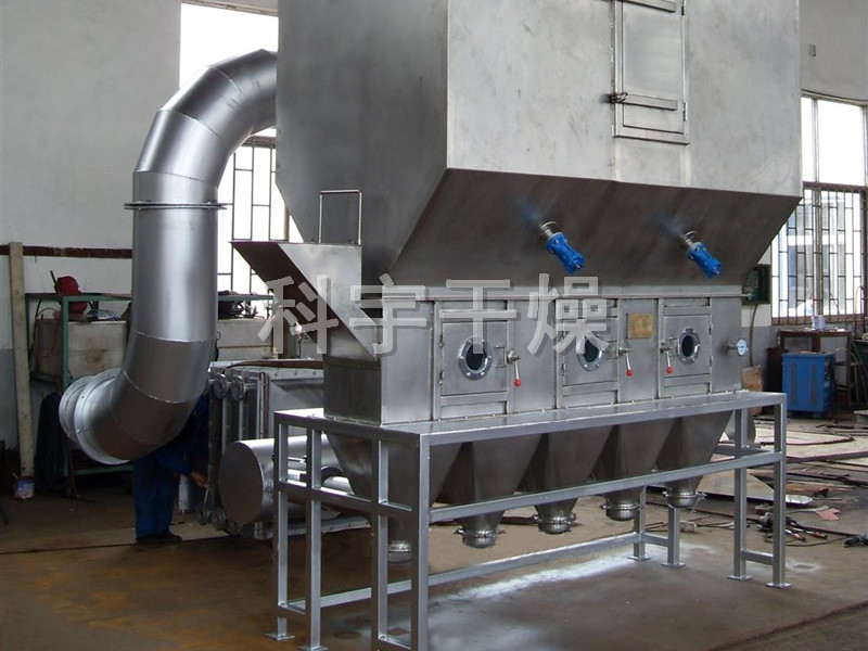 洁净的热风经阀板分配进入床体内,从加料器进入的湿物料被热风形成沸腾状态。由于热风与物料广泛接触,增强了传热传质的过程,因此在较短时间内就可干燥。如用连续型,物料从床体的一头进入,经过几十秒至几分钟沸腾干燥,自动从床体另一头流出。本设备一般进行负压操作。