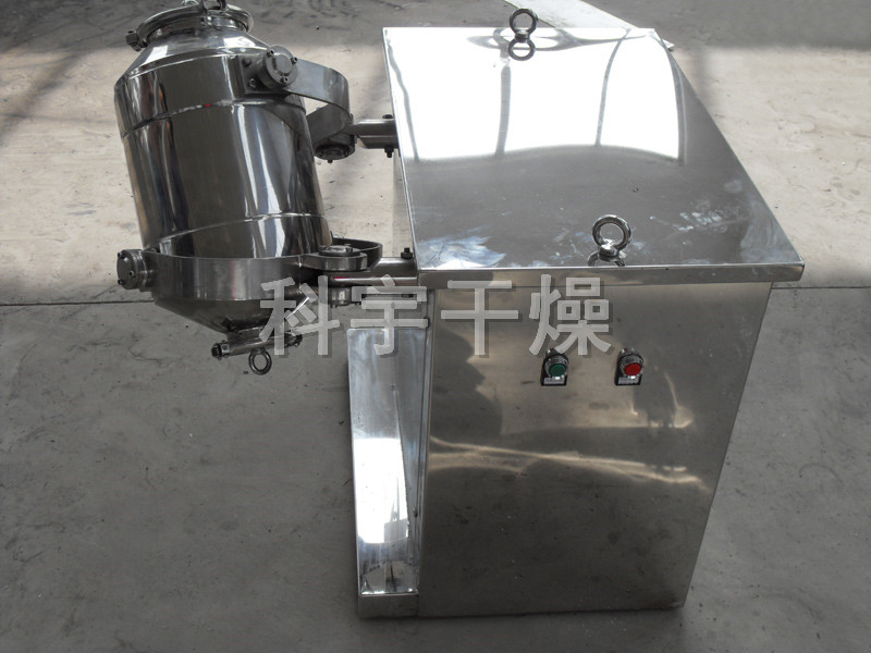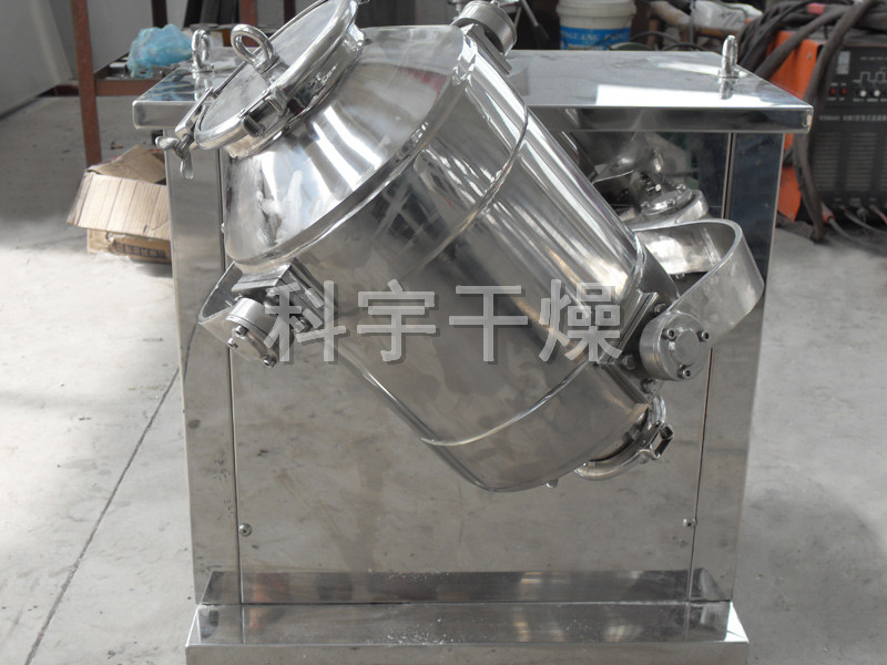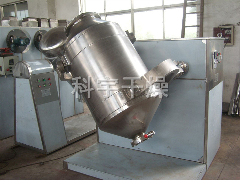 装料的筒体在主动轴的带动下,作周而复始的平移、转动和翻滚等复合运动,促使物料沿着筒体作三向复台运动,从而实现多种物料的互相流动、扩散、积聚、掺杂,以达到均匀混合的目的。