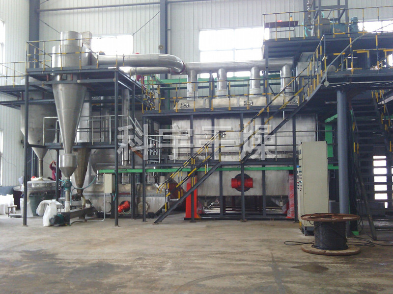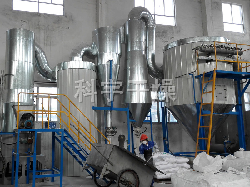 热空气切线进入干燥器底部,在搅拌器带动下形成强有力的旋转风场。膏状物料由螺旋加料器进入干燥器内,在高速旋转搅拌桨的强烈作用下,物料受撞击、磨擦及剪切力的作用下得到分散,块状物料迅速粉碎,与热空气充分接触、受热、干燥。脱水后的干物料随热气流上升,分级环将大颗粒截留,小颗粒从环中心排出干燥器外,由旋风分离器和除尘器回收,未干透或大块物料受离心力作用甩向器壁,重新落到底部被粉碎干燥。