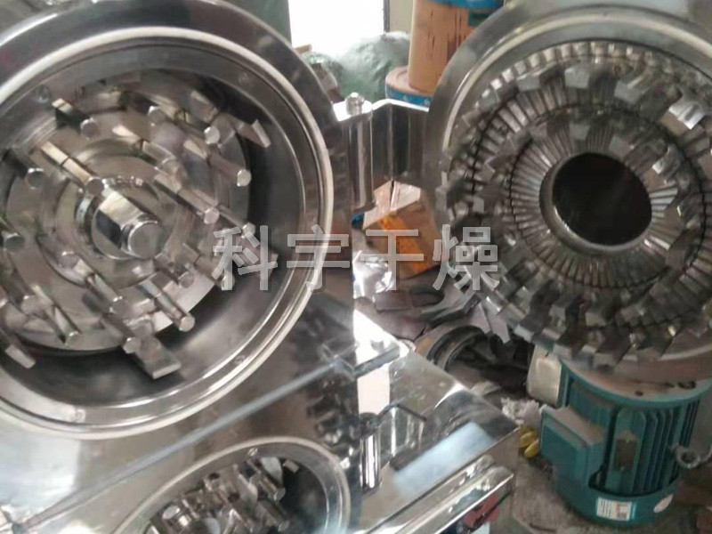 物料由进料斗送进粉碎室,经刀刃和刀座的冲击,旋转刀和固定刀同时剪切粉碎,由于受到旋转离心力的作用,物料自动从出口处流出。